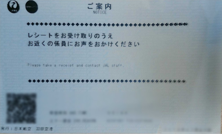 どこかにマイルはJALタッチ&ゴーサービスが利用でき、事前座席指定が済んでいればチェックイン不要で保安検査場に直行することが可能なのですが、私はクラスJへのアップグレードや、座席変更をする場合があるため、いつも通りまず自動チェックイン機へ。ところがなぜかエラーとなり以下画像のようなレシートが出てきました。