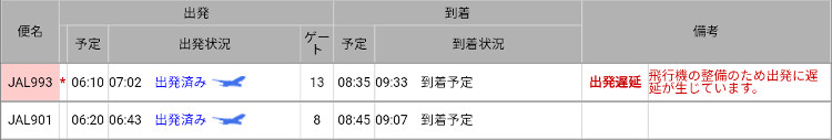 当日の運行状況。当初予約していた便は52分遅発、振り替えて搭乗した次の便も23分遅発となりました。