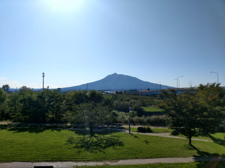 ▲岩木川の河川敷に出ると、「津軽富士」岩木山がきれいに見えました。リンゴ以外の風景もなかなか素晴らしいです。