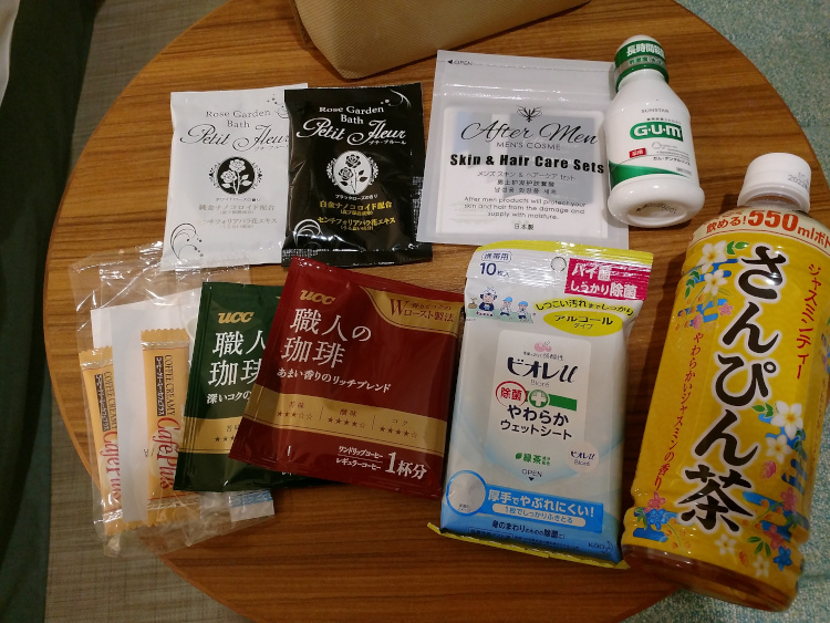 ホテルオリジナル特典として、ペットボトルのさんぴん茶、インスタントコーヒー、入浴剤、除菌シート等が入ったアメニティパックをチェックイン時にもらえます。