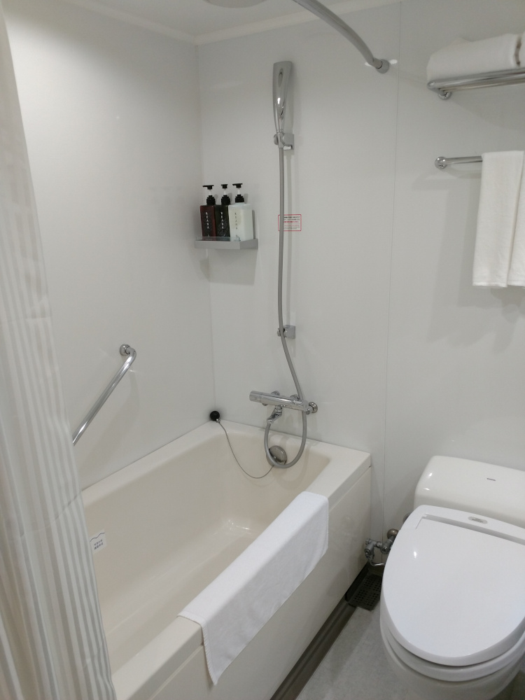 ▲お風呂は普通のユニットバスですが、白で統一され明るく清潔感がありました。シャンプーやボディソープはポンプ式(花王レアーナ)です。