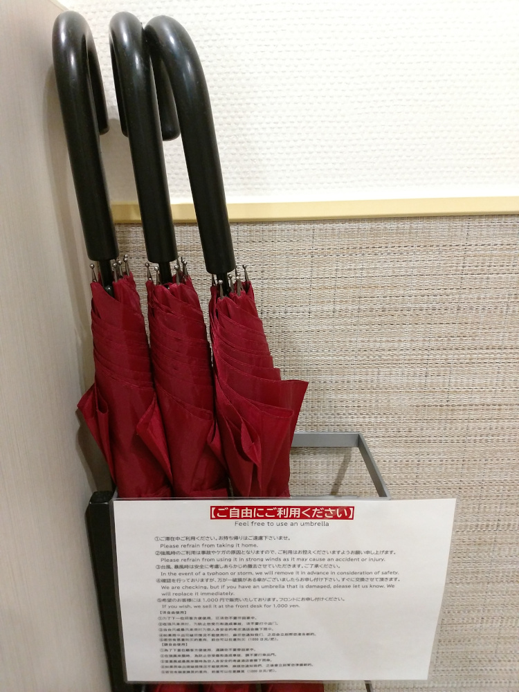 ▲部屋ごとに貸し傘が置いてあり、自由に使うことができます。