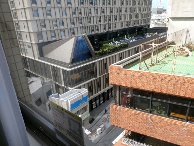 ▲9階にある部屋からの眺望はこんな感じで、国際通りが眼下にちょっとだけ見えます。斜向かいはホテルコレクティブのインフィニティプールです。(JALシティにプールはありません)