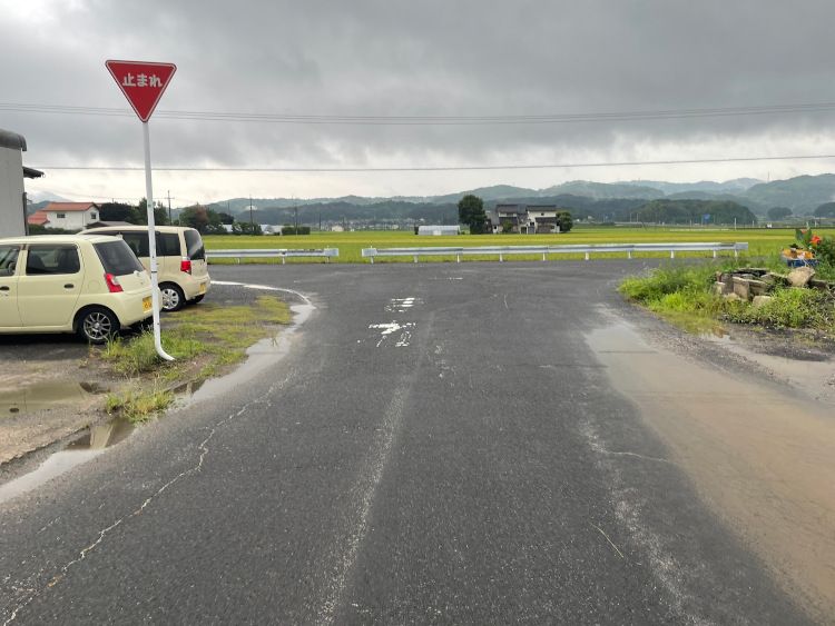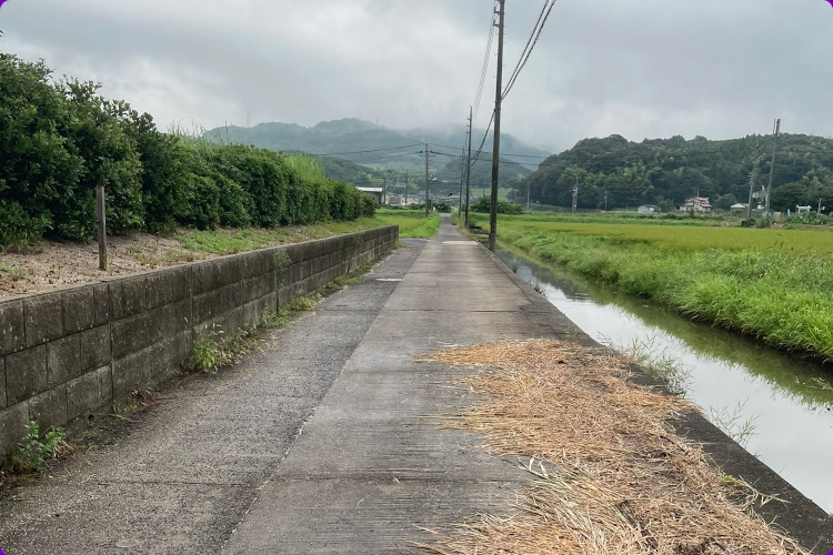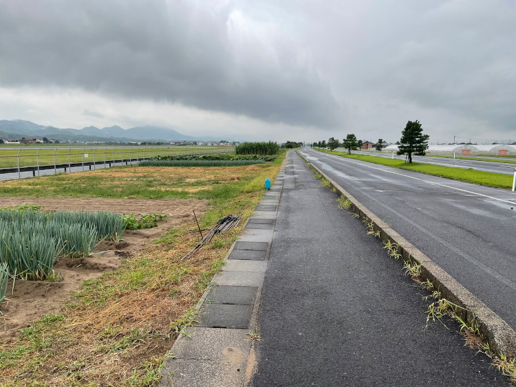 ▲突き当りのT字路を右へ。この先空港敷地を外れると田畑と住宅の脇を歩くことになります。