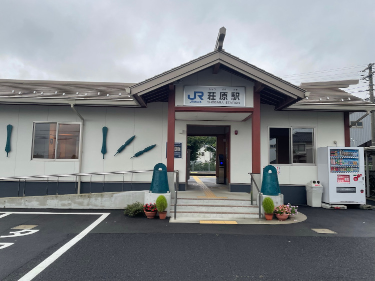 ▲右手に荘原駅の駅舎と跨線橋が見えてきました。